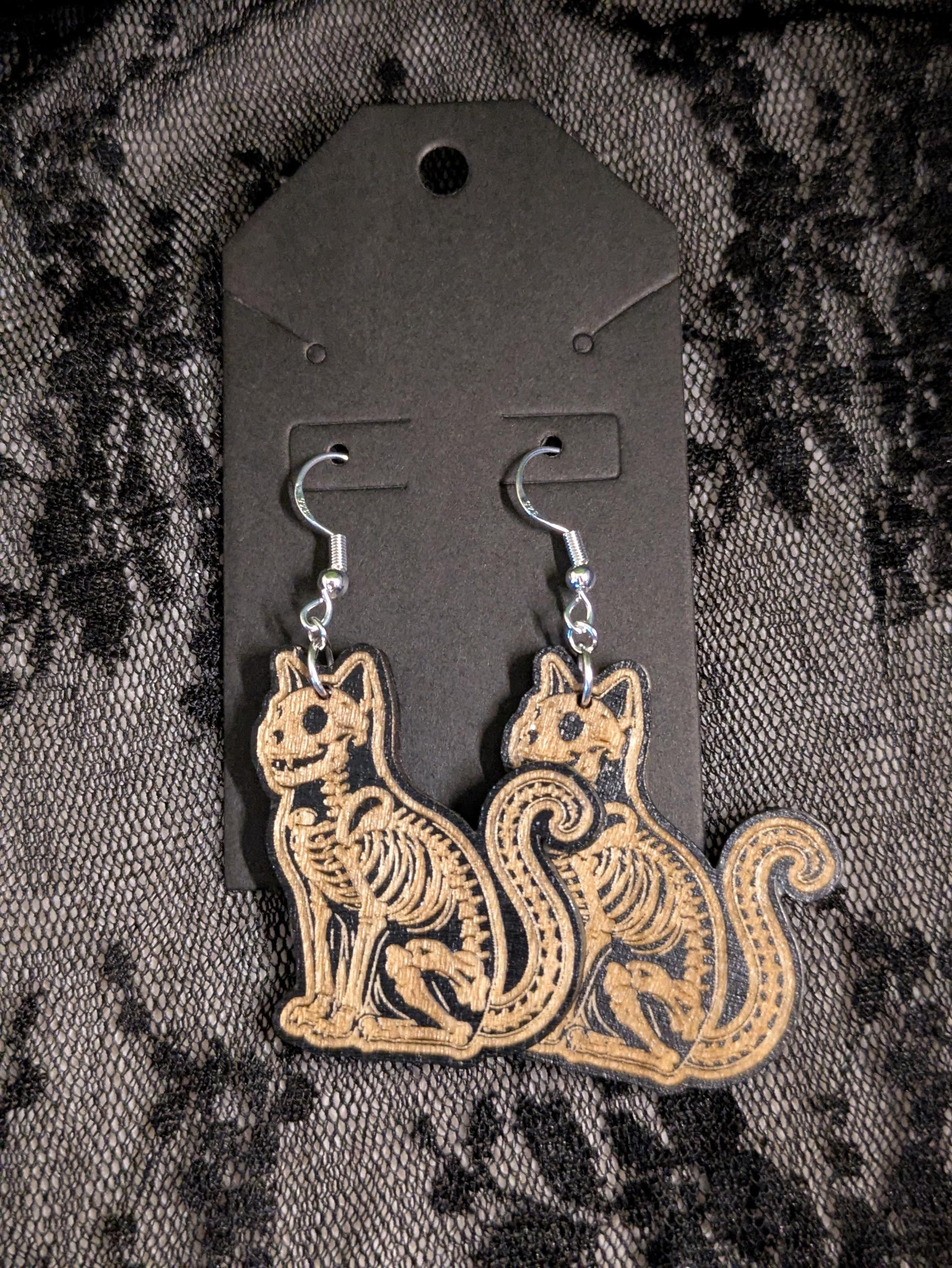 Wooden Cat Skeleton Earrings - Laser Cut & Engraved Handmade Wooden Jewelry